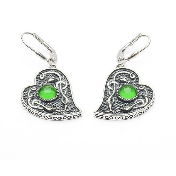 Wood Quay - Oxidised Sterling Silver green glass stone set Heart Earrings