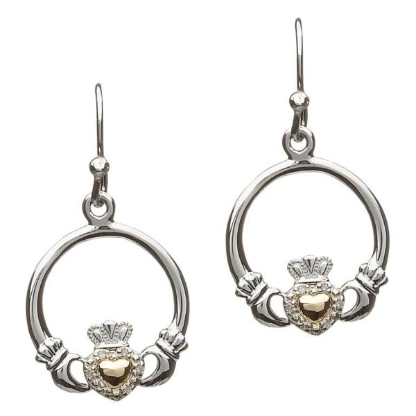 Irish Silver and 10ct Gold Heart Diamond set Claddagh Earrings