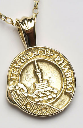 This Gold pendant is decorated with a Scottish Celtic crest design in the shape of a shield. With this pendant, you can proudly display your Family Crest or Coat of Arms along with your Family Name.