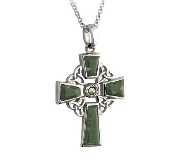 This Connemara Celtic cross is set with rare Connemara marble, found only in Ireland and in demand all over the world. Known for its green appearance, Connemara marble is one of Ireland's trademarks and is older than 600 million years old.