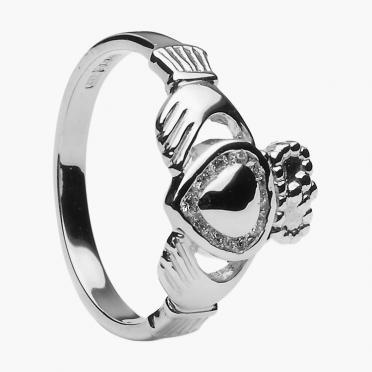 Ladies 14ct White Gold Diamond Set Gold Heart Claddagh Ring