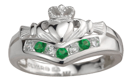 Irish Sterling Silver Claddagh Wishbone Ring Emerald & Cubic Zirconia stone set