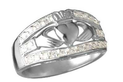 Irish Sterling Silver wide Claddagh Ring Cubic Zirconia stone set