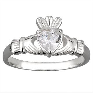 Irish Silver Claddagh Ring with White Cubic Zirconia Heart