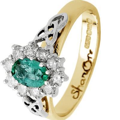 This Emerald & Diamond cluster in 14ct yellow & white gold has been inlayed with the Celtic Trinity Knot. The Emerald in this ring is an oval stone and is surrounded by 10 Brilliant cut Diamonds