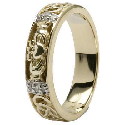 This wedding band incorporates both Claddagh and Celtic design, the Claddagh which symbolizes love, friendship and loyalty, the Celtic knot symbolizes eternal life. It has been exquisitely hand-crafted and Pave set with Diamonds in 14ct yellow gold.