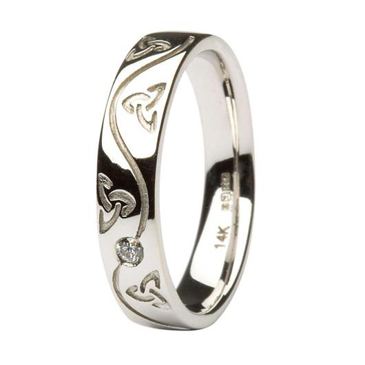 This beautifully hand crafted Celtic Gents wedding ring has the famous Trinity Knot recessed six times into it down each side of a beautiful glistening Diamond, all of this in 14ct white gold.